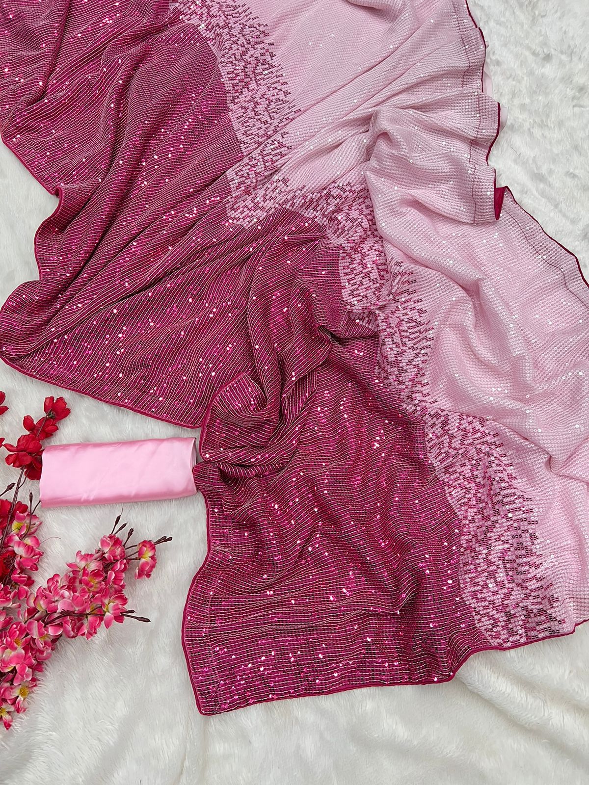 A moment in time. Like a million starts in the sublime sky, delicately handcrafted sequins work bring out the vibrancy of this silver georgette saree.