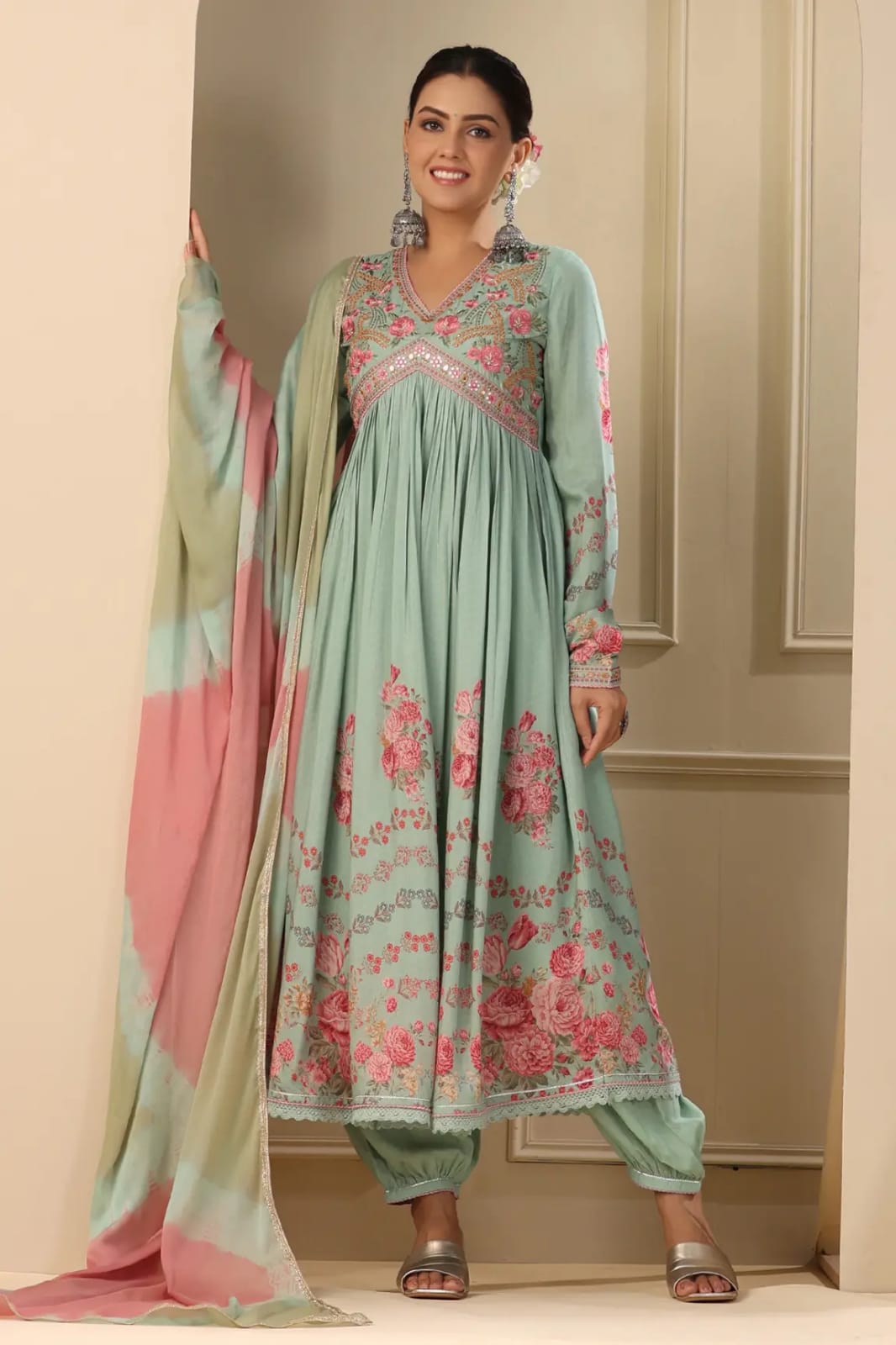 Alia Cut Suit With Hand Embroidery, Zari Weaving and Prints 3 Piece Set