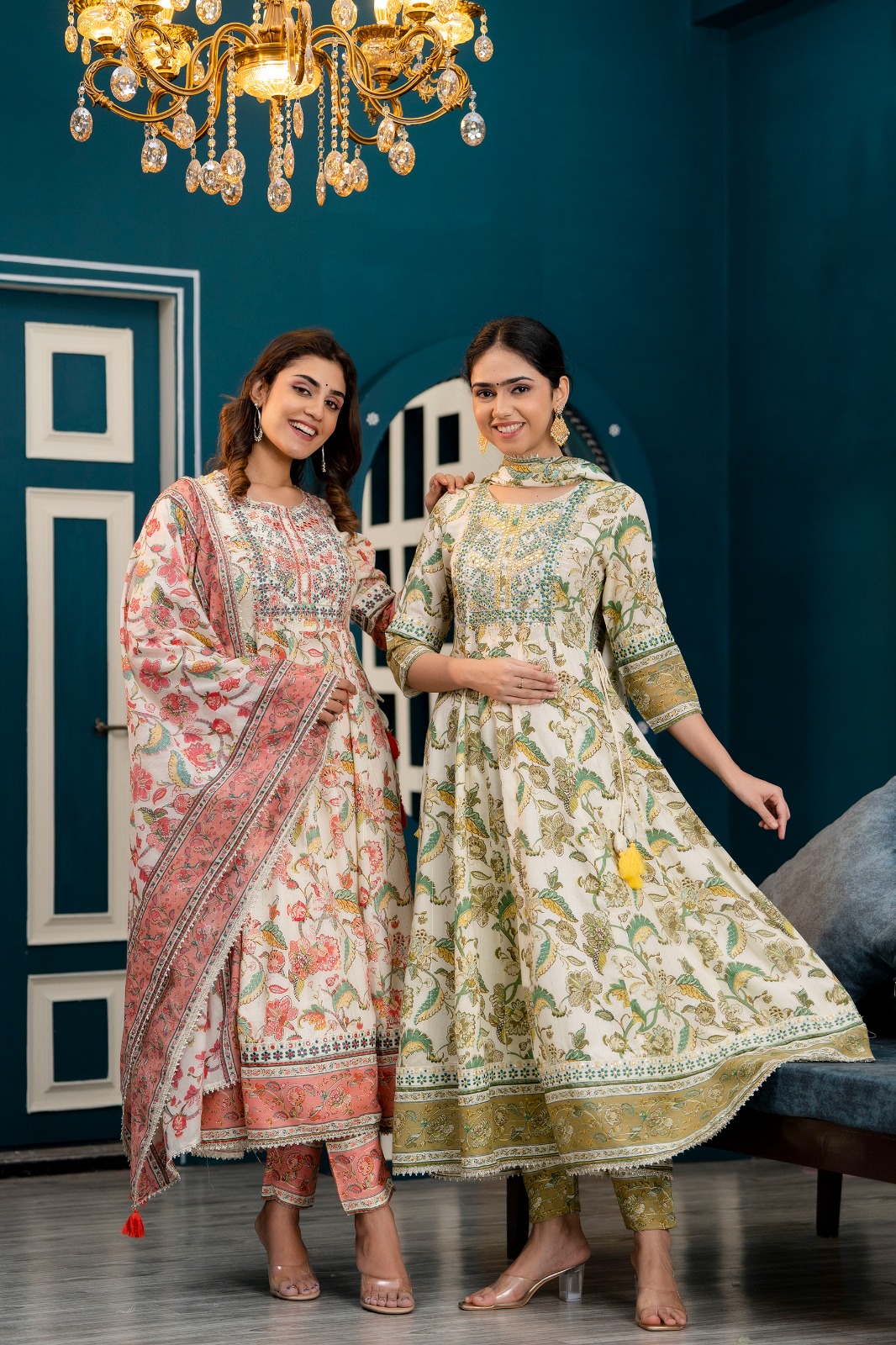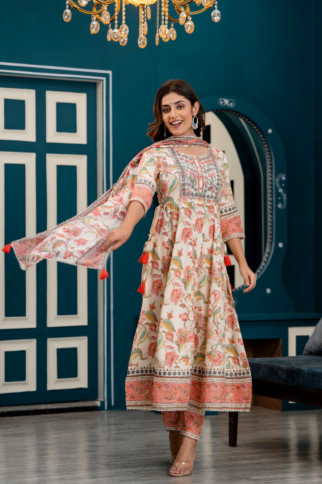 Classical Floral Block Print Lurex Cotton With Heavy Embroidery Kurti 3 Piece Set