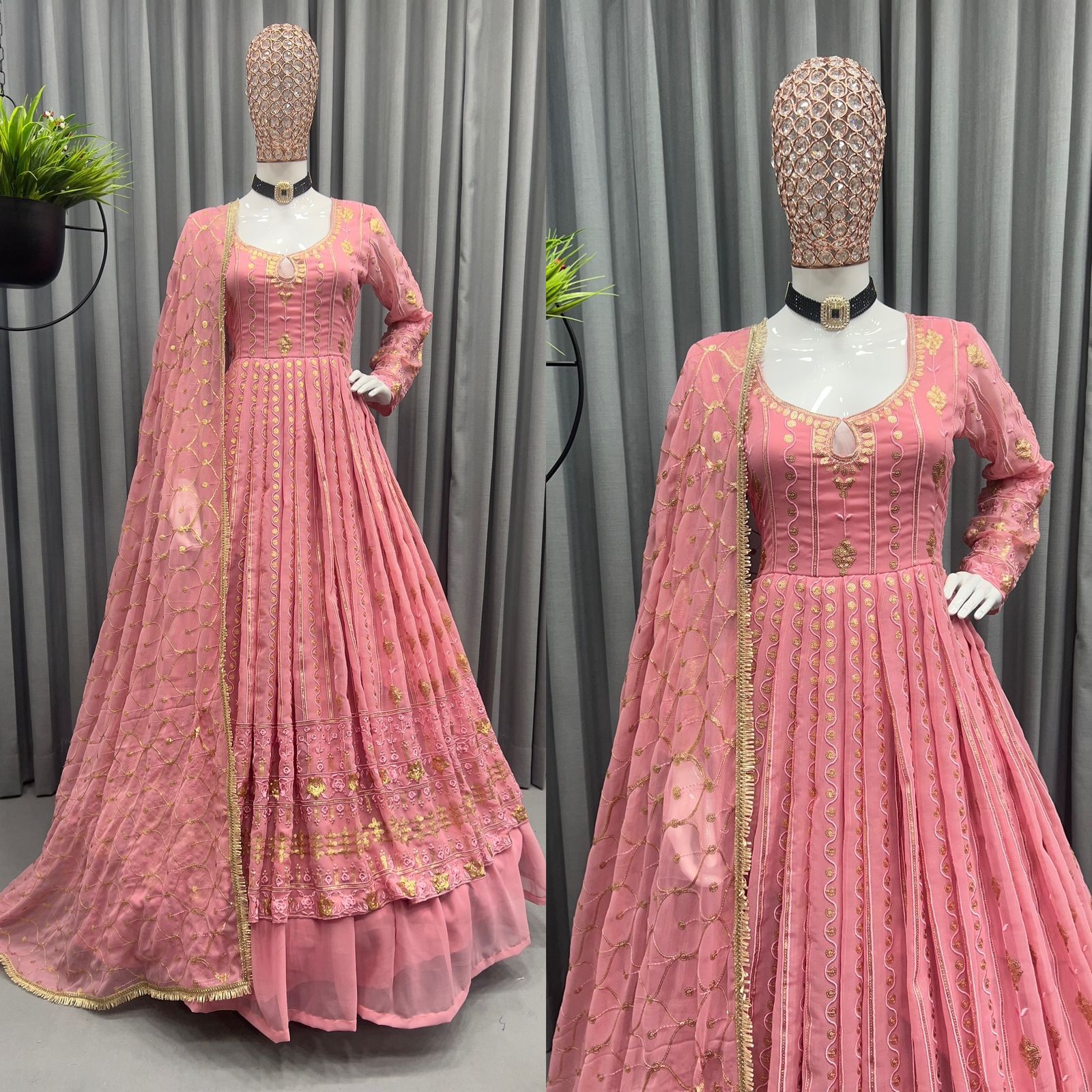 Looking for this same color beautiful Designer Suit On heavy Faux Georgette fabric & inner with Thread & Sequence work and Lehenga on also Georgette fabric & inner and Dupatta on also Georgette fabric with Thread with Sequence work.