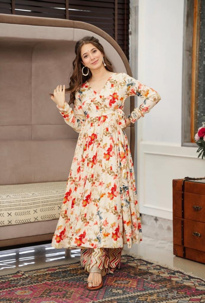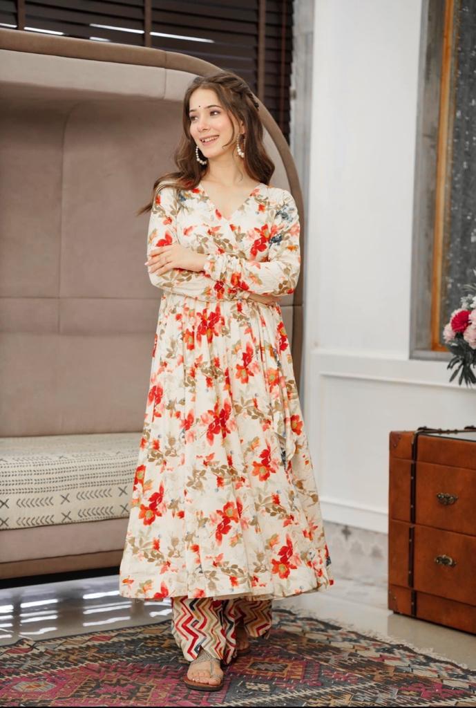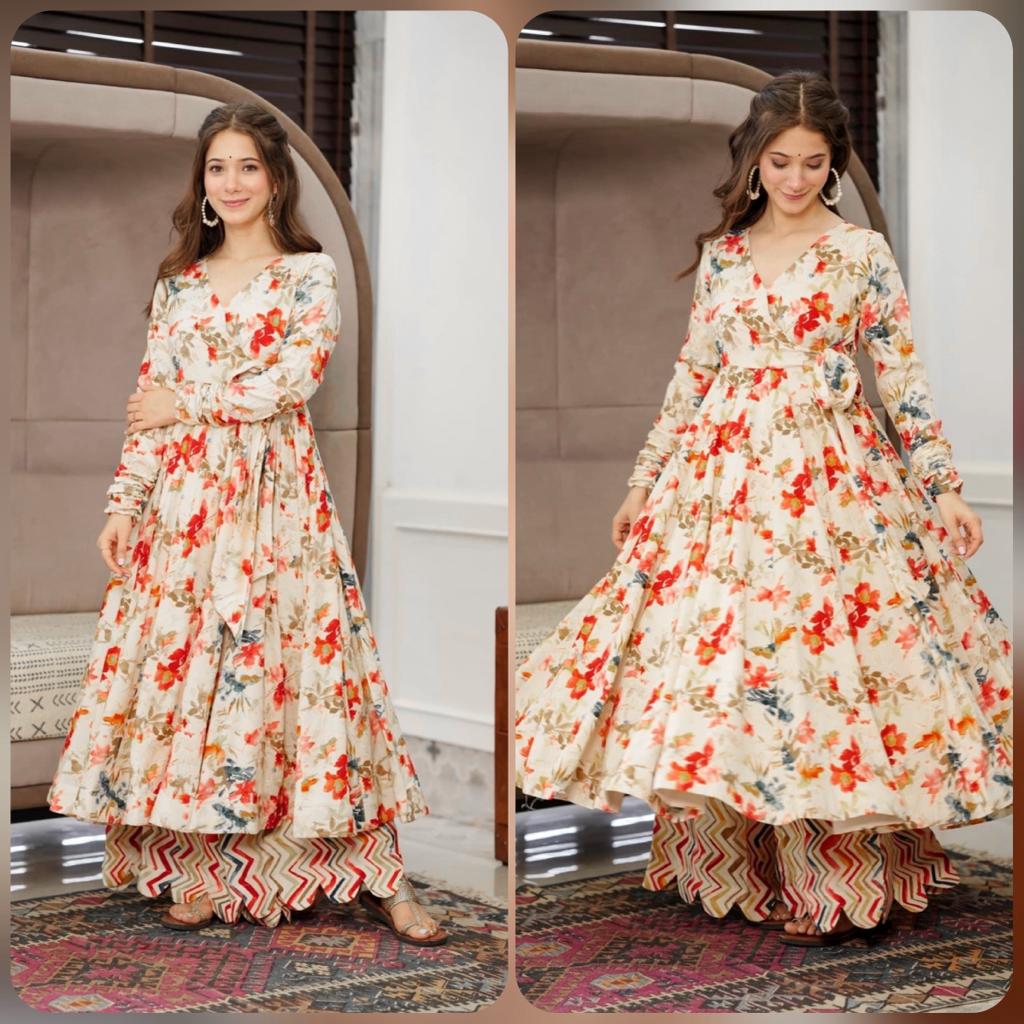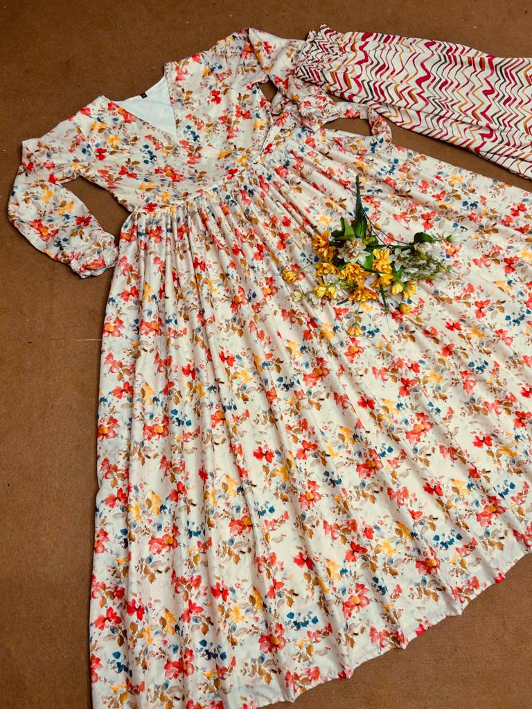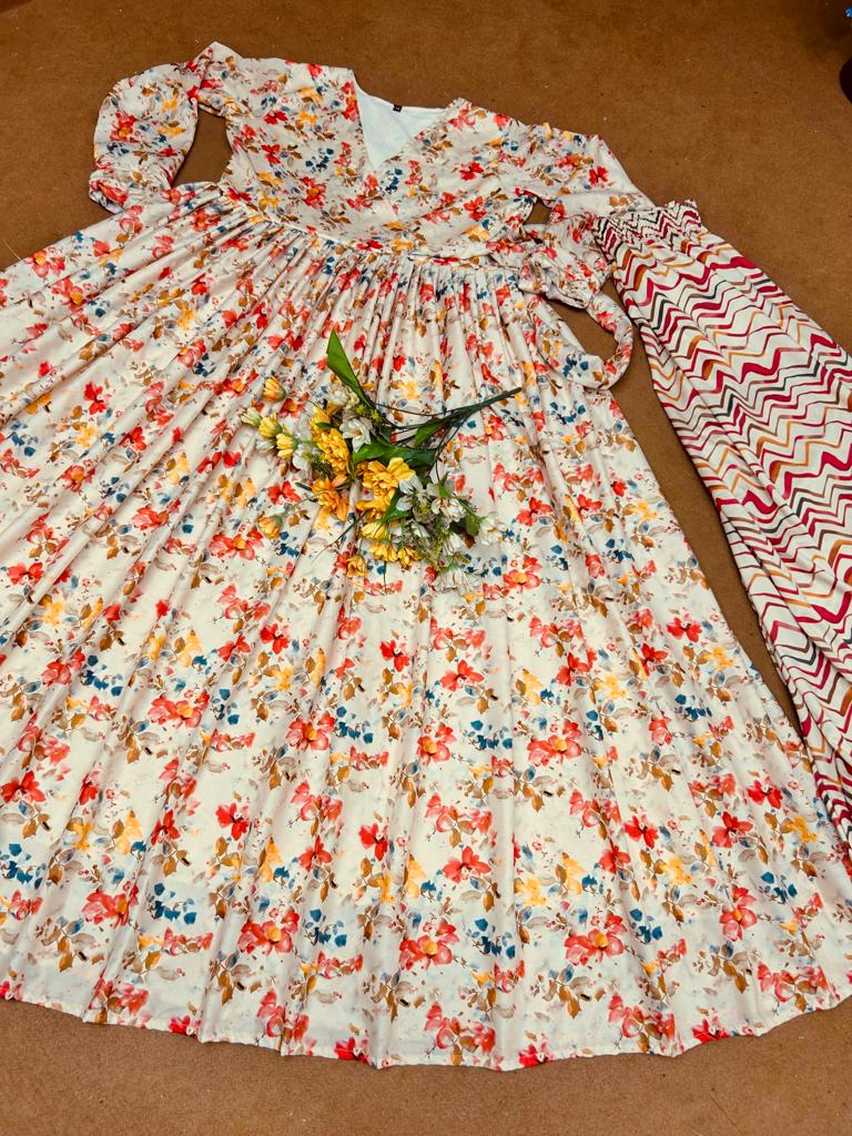 GOWN FABRIC* :*_SANT CRAPE SILK WITH FLOWER DIGITAL PRINT WORK WITH FULL RUFFLE STYLE SLEEVES_*