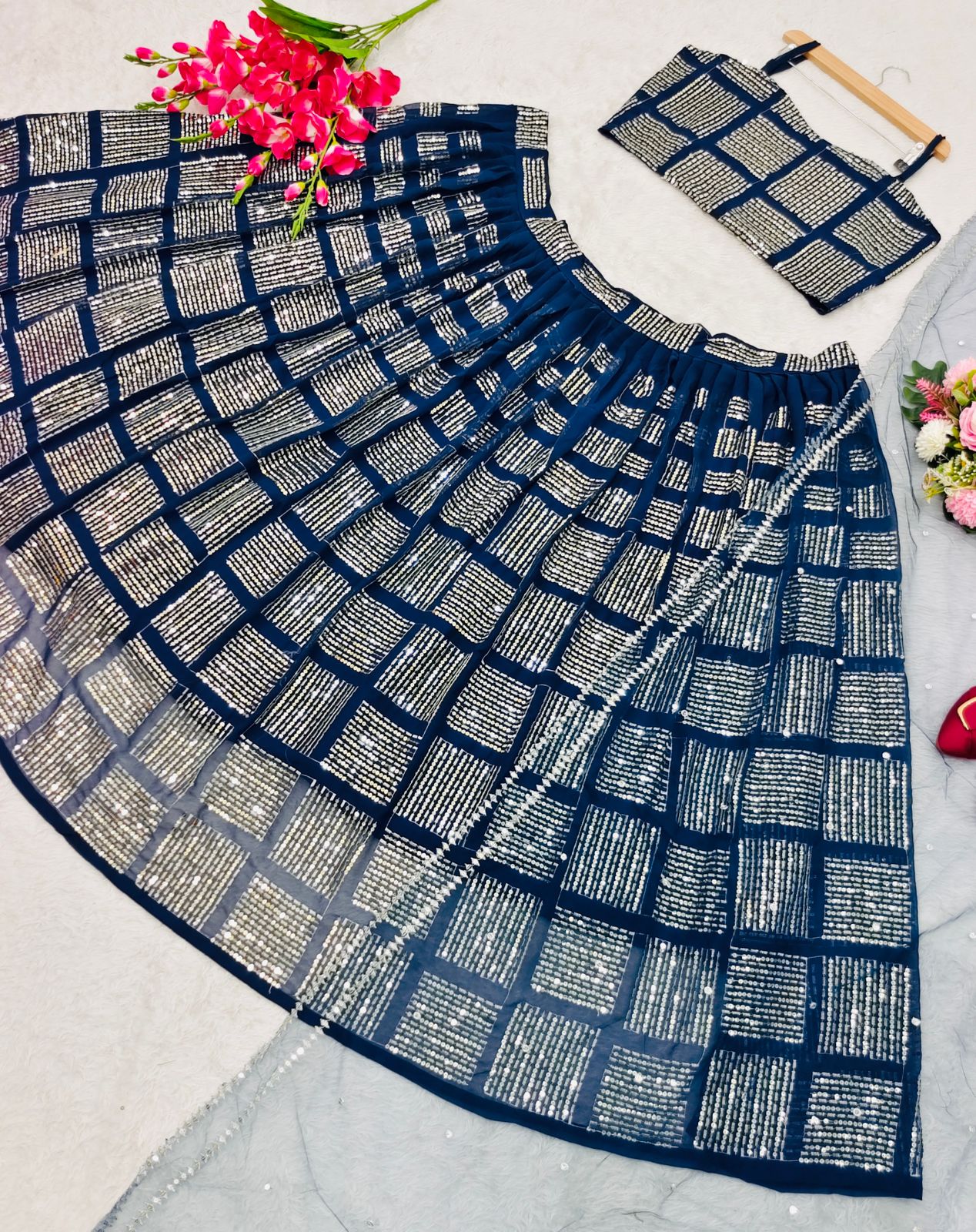 *LEHENGAS FABRICS* : HEAVY FAUX GEORGETTE WITH HEAVY 5 MM SEQUINS EMBROIDERY WORK WITH FENCE SWANS BELT WITH