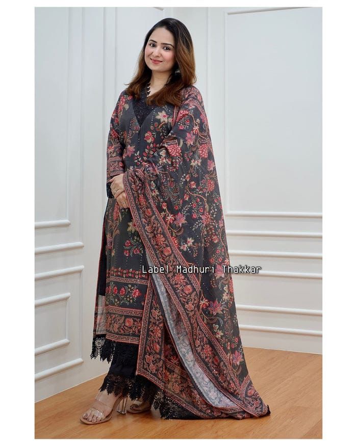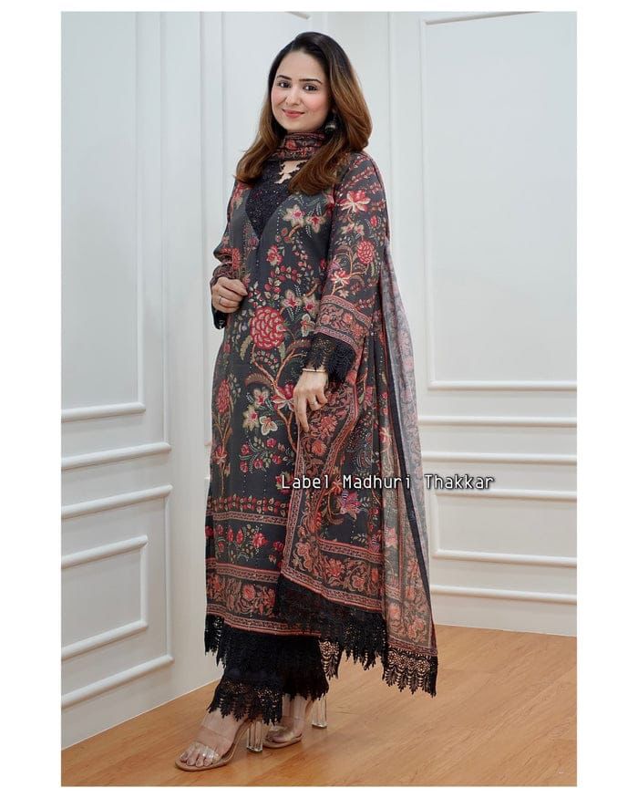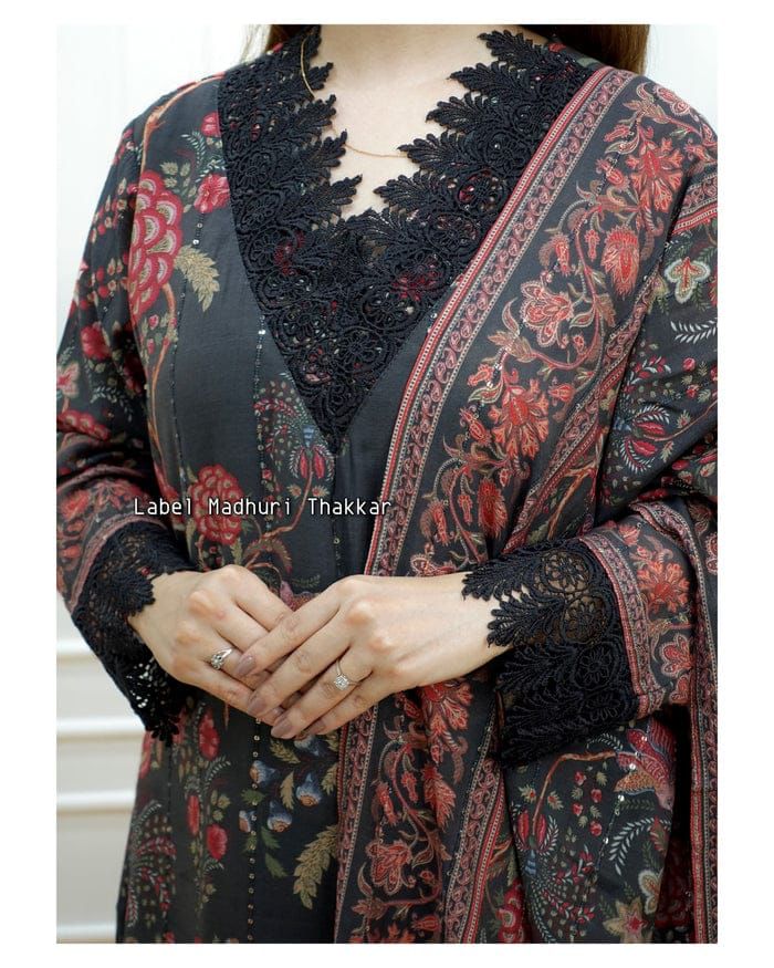 Featuring Black Punjabi Suit which is beautifully decorated with digital prints, sequin embroidery and lace detailing’s all-over. It is absolutely perfect for your upcoming occasions, it is very easy breezy and comfortable.